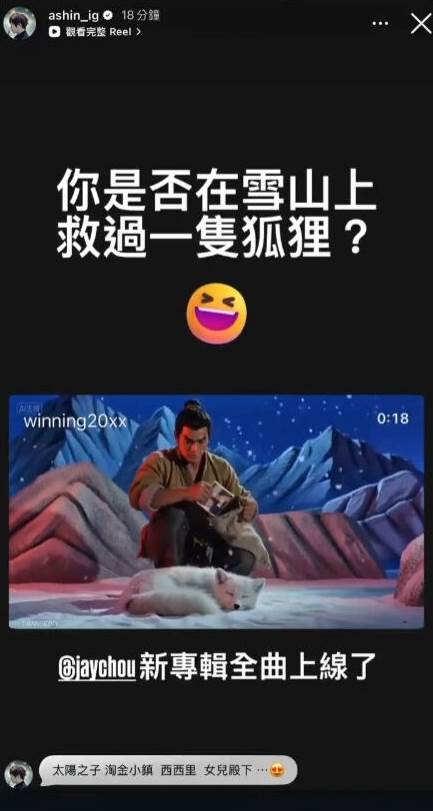 爆紅AI短片《雪山救狐狸》系列,竟也熱推周董新歌:「你是否在雪山上救過一隻狐狸」迷困梗也出現在影片裡:「沒錯,我就是那隻狐狸,我是來告訴你,周杰倫出新專輯了」,甚至引用周董電影《不能說的秘密》金句:「從我這邊到你那邊一共五步,一二三四五,杰倫出新專輯了」。同樣有趣的是,五月天阿信也透過社群限動轉發為好友宣傳,笑翻網友。