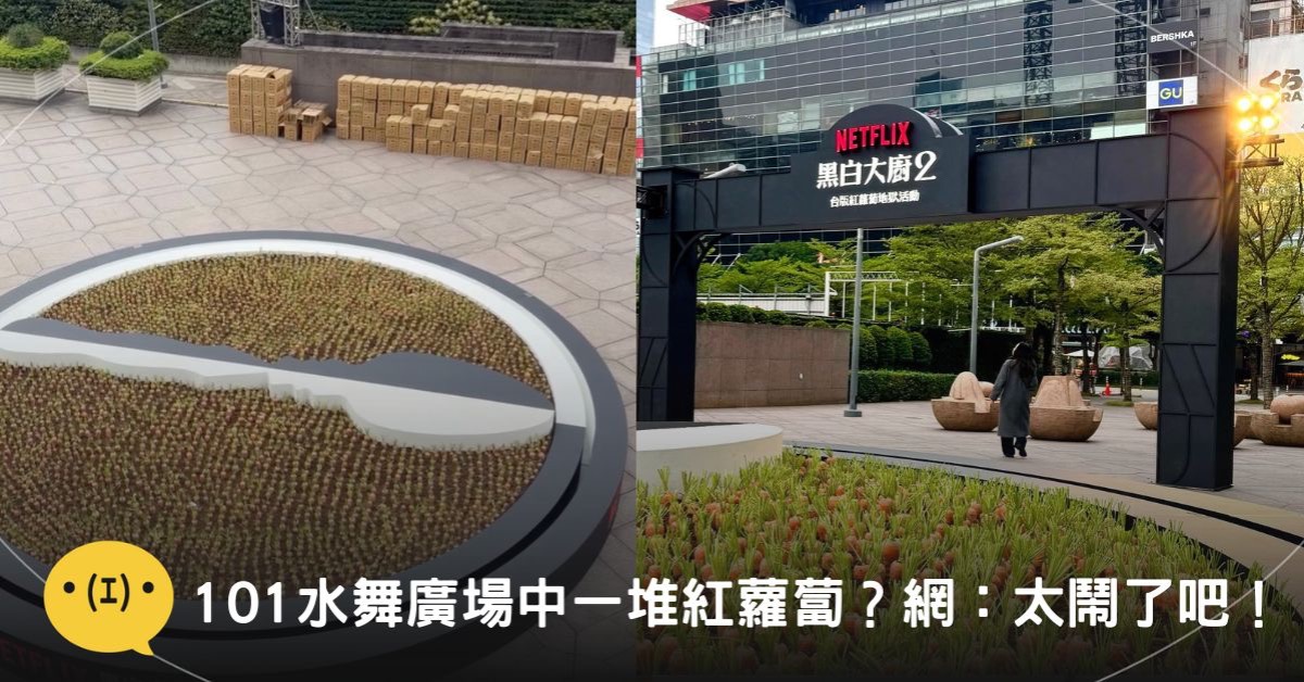 台北101水舞廣場近日出現大量「紅蘿蔔」裝置,引發路過民眾與網友熱議,紛紛納悶「101旁怎麼突然變成紅蘿蔔田?」原來這並非市政工程或農產展售,而是影音平台 Netflix 為實境料理節目《黑白大廚:料理階級大戰》第2季在台舉辦的限定快閃活動。