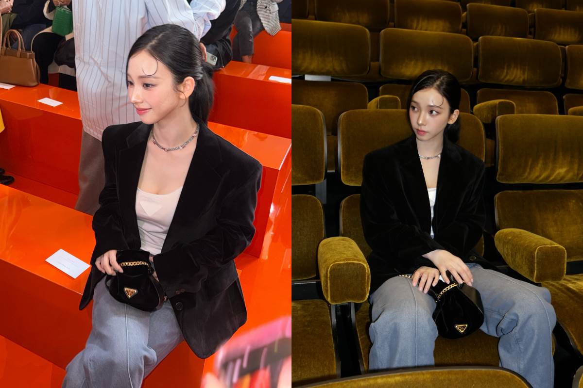 aespa 成員 Karina 以率性造型現身Prada秀場,天鵝絨西裝外套內搭簡約的logo背心,下半身以牛仔褲營造隨性感,手上那只小巧的迷你皮革水桶包更是點睛之筆,包身綴有亮眼的金屬鏈條與精緻的金球裝飾,為整體造型增添了奢華的細節與前衛的氣息。