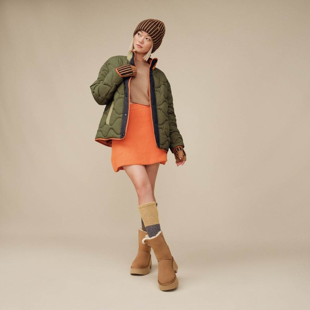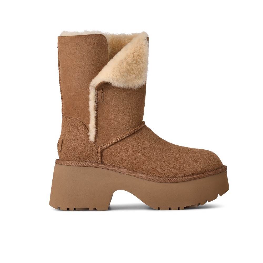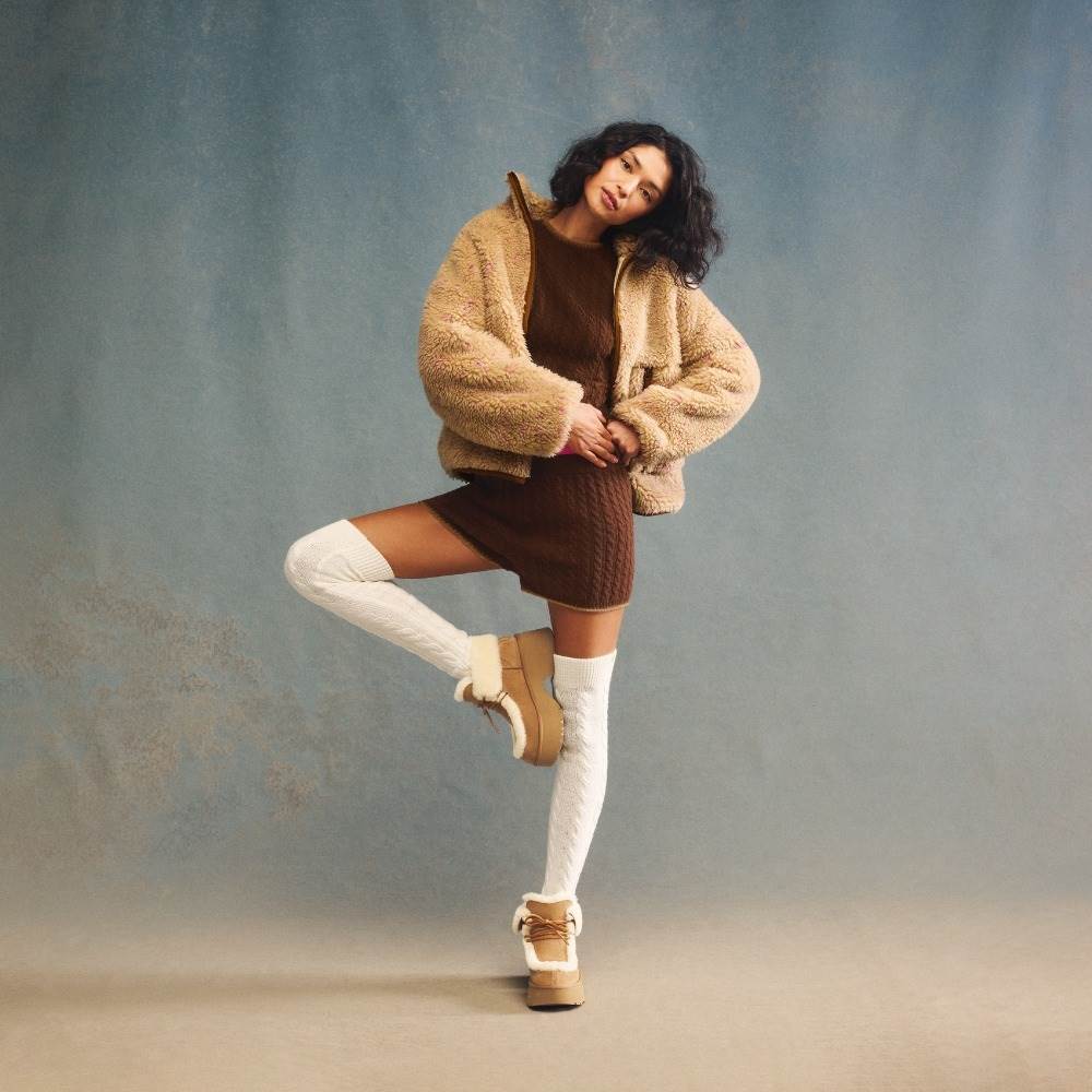 它同樣具備可翻邊設計,能自由切換俐落高筒與毛毛翻摺兩種風格,而平台厚底則維持UGG一貫的輕量感,穿起來舒適又有高度。整體氛圍比Lace Up更「冬季風格濃厚」,帶有更明顯的存在感,適合搭配大衣、毛呢短裙或針織洋裝,是一雙能讓冬天穿搭瞬間變得更有質感與層次的主角靴款。