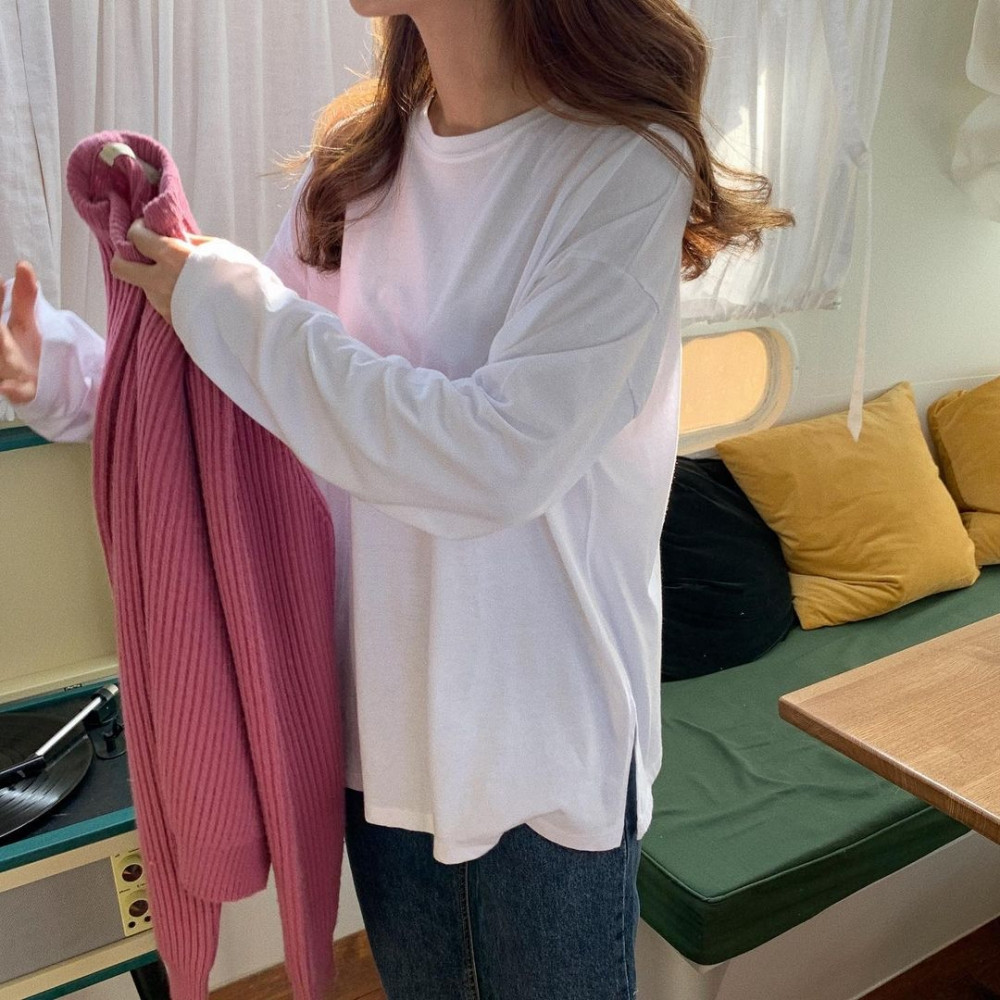 也不用想得太複雜,就是一般白T就好,想要更加精緻的話、也可以選擇這種下擺開衩的白T款式,露出來的下擺也會更加有細節感。