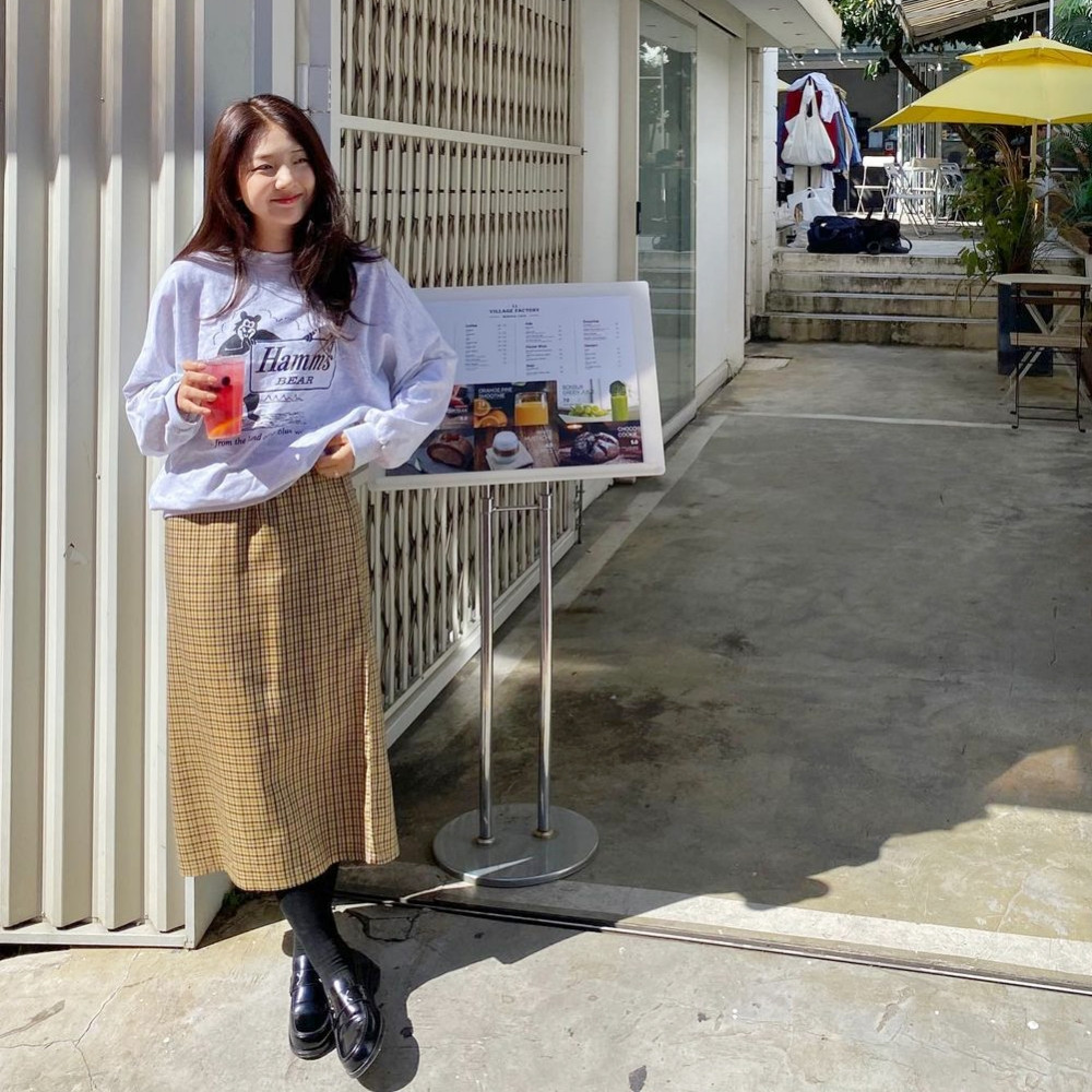 除了褲子之外、長裙也是韓妞很常搭配的技巧,相對於版型較寬鬆的衛衣、大學T,長裙就建議可以選擇較修身的款式,上寬下窄、非常修飾身材,讓中性的衛衣、大學T多了一分女人味。