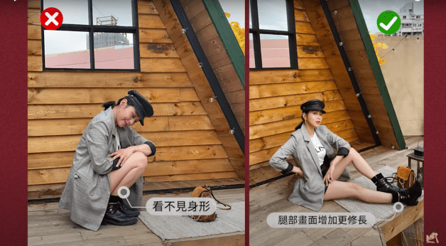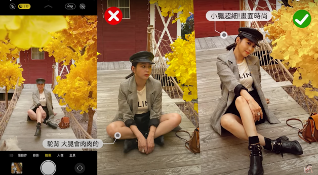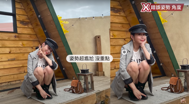 應該要讓雙腳從側邊延展出去,另外可以拿一些小道具增加畫面豐富感,是不是變得很有雜誌封面的既視感呀!