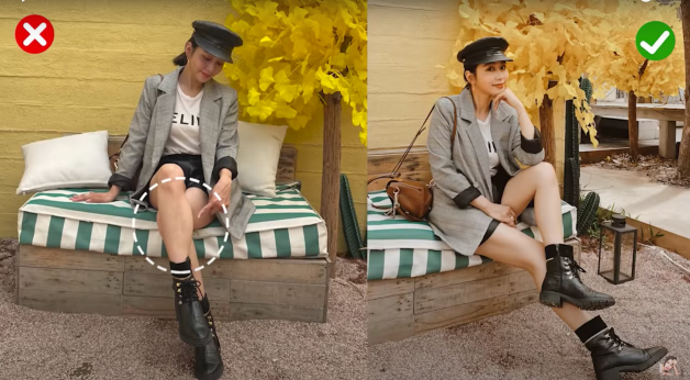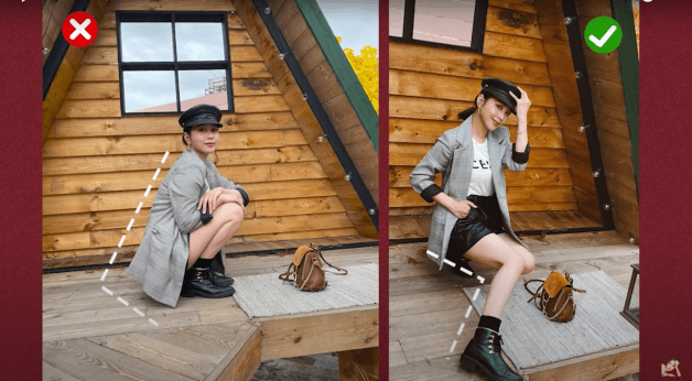 很多人在坐著拍照的時候會慣性翹腳,但這樣會讓小腿看起來很粗!為了照片更照騙一點,姐妹們這招可要好好筆記呀~讓小腿下方腳踝放在另一隻腳上,既可以完美避開小腿肉的部分,也能讓腿更加的延~伸喔!