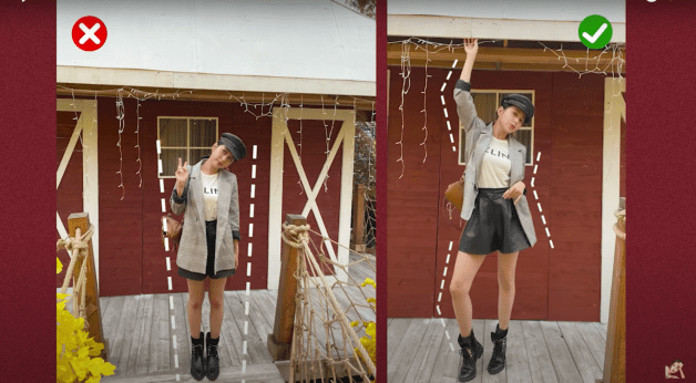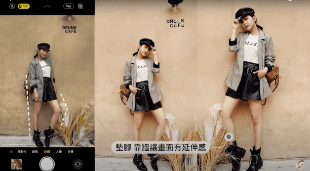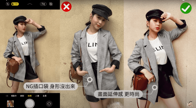 最好的方式是將鏡頭角度往下調整,用踮腳+靠牆的姿勢延展變化,讓畫面更有延伸感 。