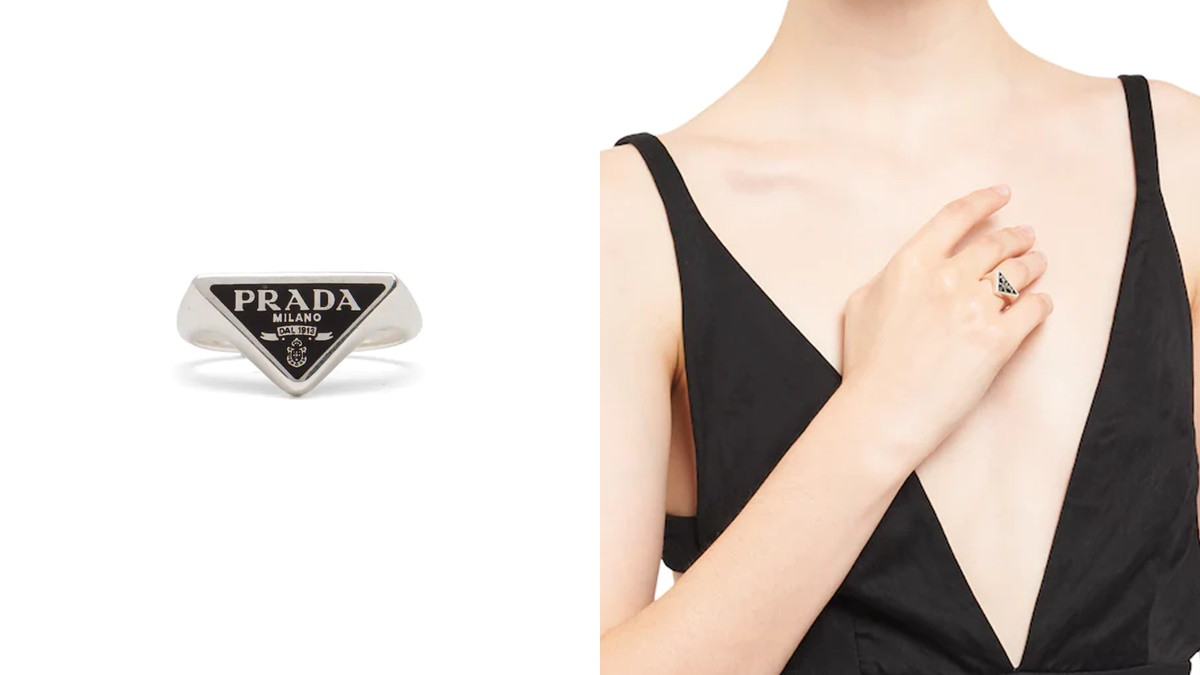 Prada Symbole 系列戒指,一共推出黑、銀、粉三種配色,925銀材質搭配標誌性的三角形Prada Logo,讓龐克元素更添優雅氣息,是一款男孩、女孩都能輕鬆駕馭的神仙款式。