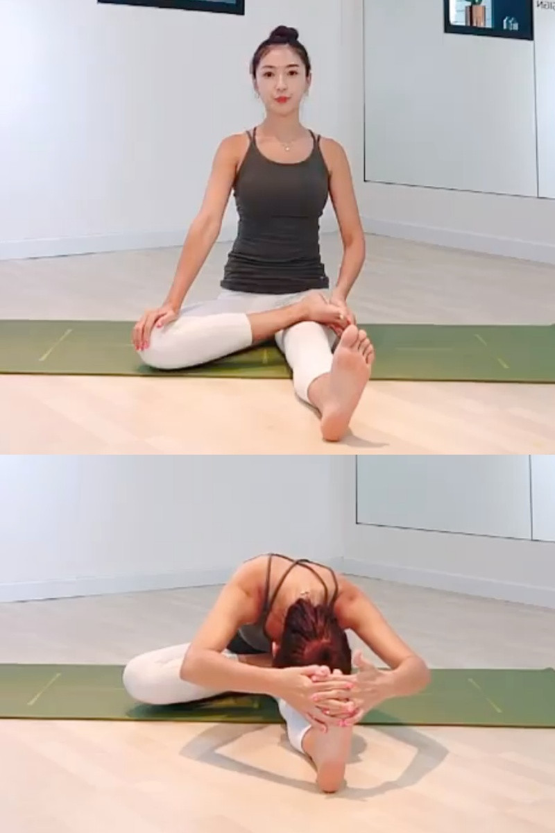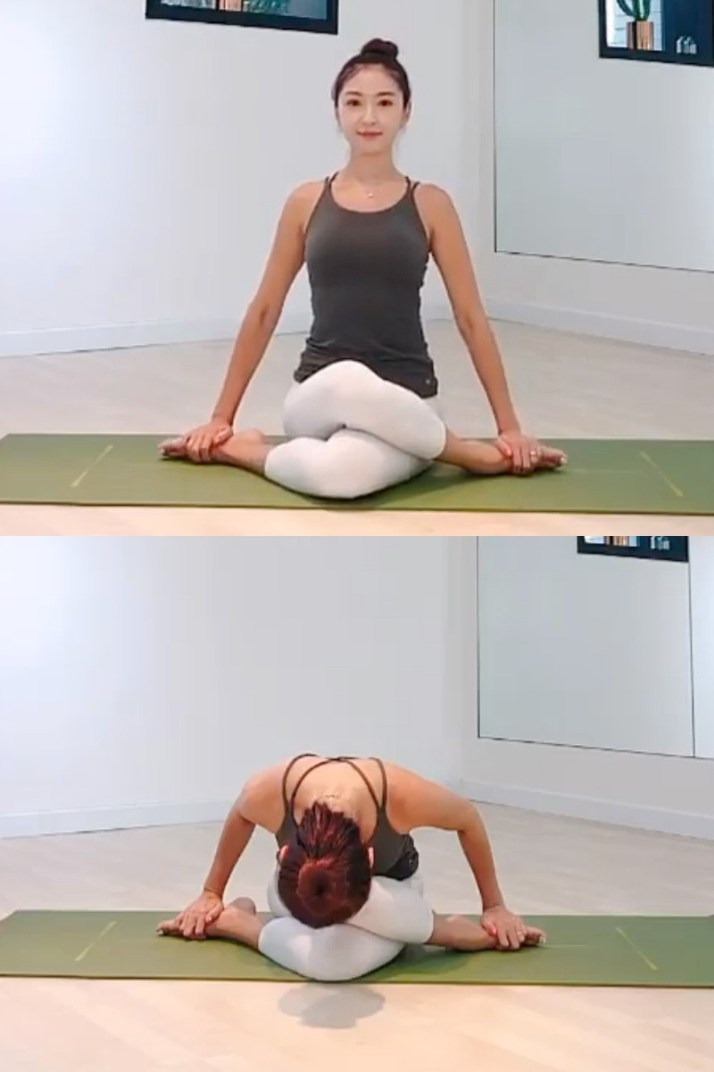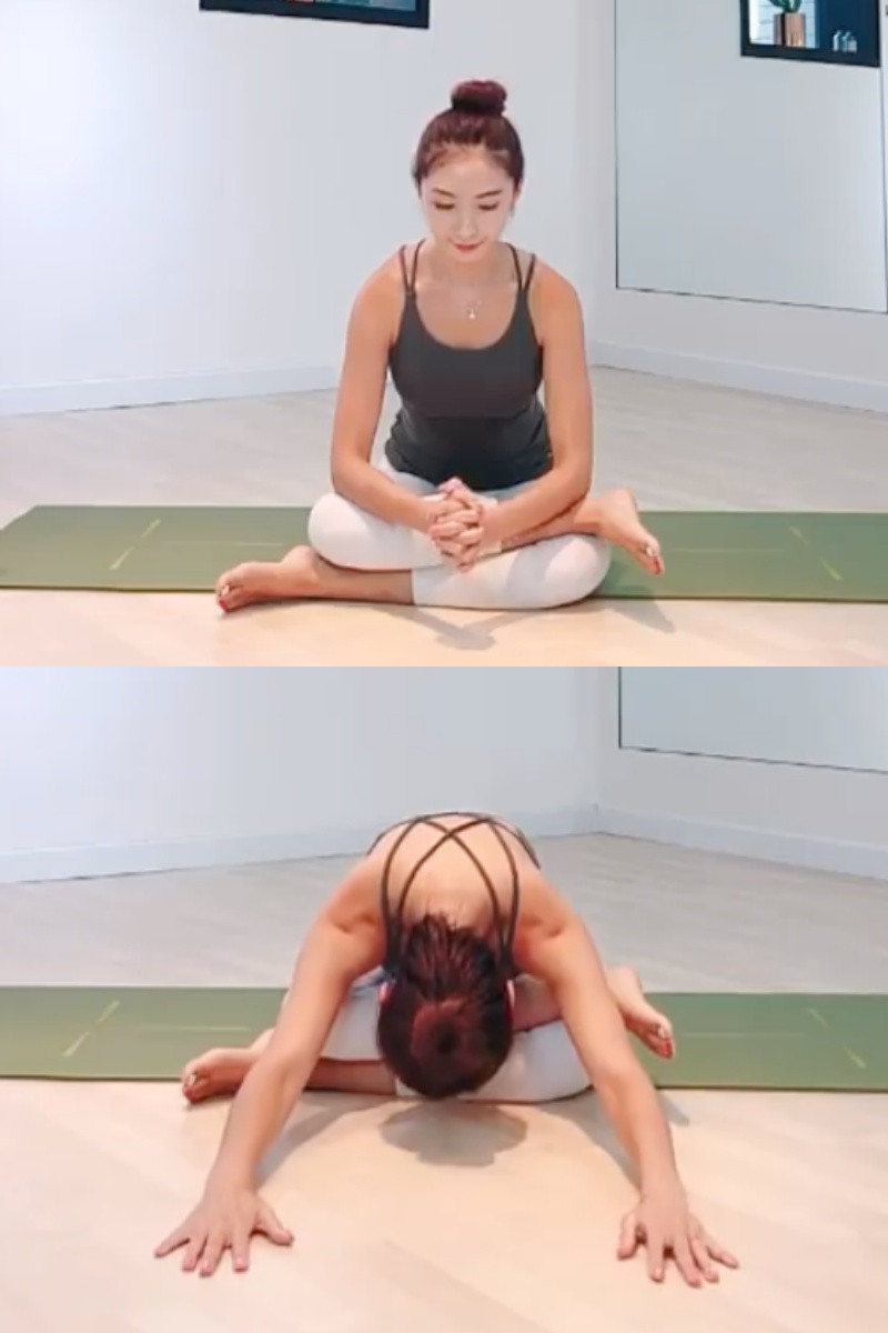 預備動作我們先盤腿坐(左腳或右腳在上都沒關係),接著雙手往前伸直,並緩慢地將身體往前彎,彎曲到自己的極限,以此幫助我們放鬆舒展緊繃的肌肉們。停留30秒後,再將左右腳上下交換,盤腿前彎。