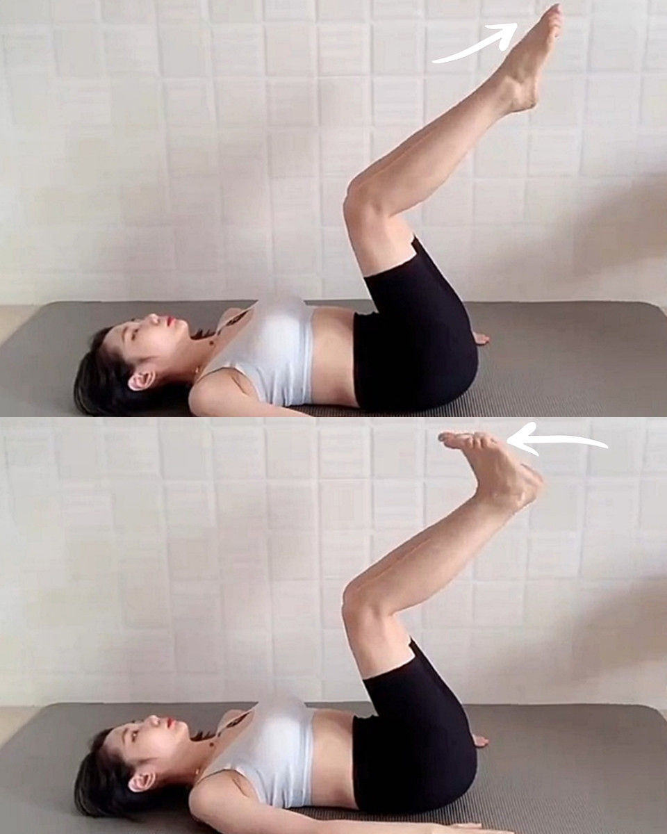 一樣先平躺在地,將雙手自然伸直擺在臀部側邊、雙腿屈膝抬起,大小腿約成90度,接著將腳背上下擺動、讓腳踝充分伸展,這個動作除了瘦腳踝之外、更是瘦腿的基本動作,對於腹肌也有運動效果。