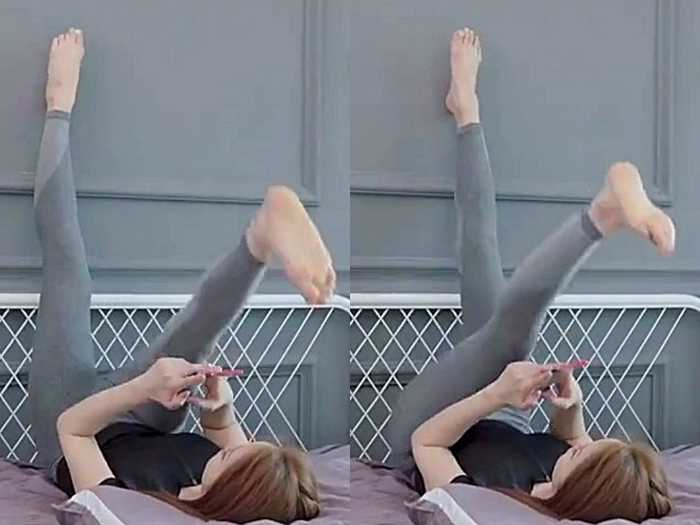 以床邊的牆壁靠牆抬腿,接著將腿輪流往身體方向向下,盡可能伸直雙腿、靠近身體就好。