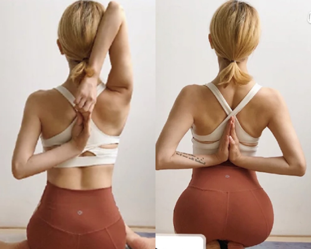 接著就是低頭族、3C族必備的開肩動作!這組動作可以幫助展開肩頸鬱結,還能矯正駝背、虎背熊腰等問題~首先呈跪坐或坐姿,注意身體需保持挺直、不能駝背,小腹需收緊,接著一手從上伸往背後,一手從下伸向背後兩手教握,堅持15秒再換邊。接著雙手在背後做出合十的動作,堅持15-20秒。