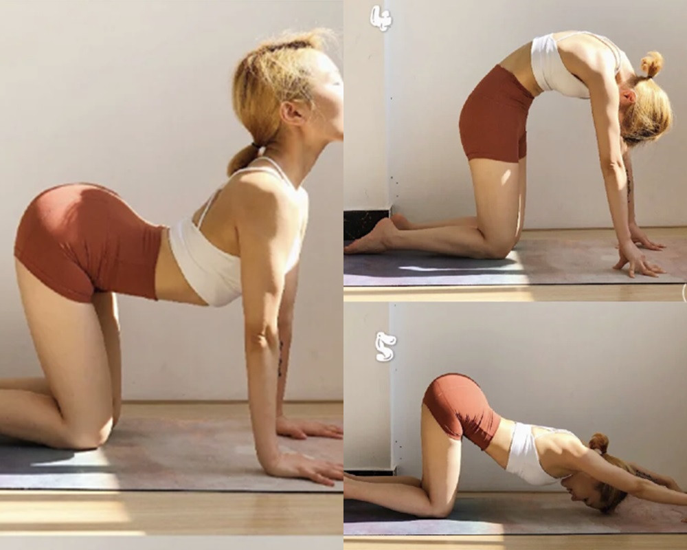 最後一步就是全身的伸展~首先四肢撐地,雙手與肩膀呈一直線,接著將頭抬起,並搭配呼吸的律動,吸氣時抬頭凹背、呼氣時低頭並將背拱起~重複這一組動作5次。最後要結束時可以身體全身像後推,並將肩膀壓到最低就結束這套拉伸運動啦!