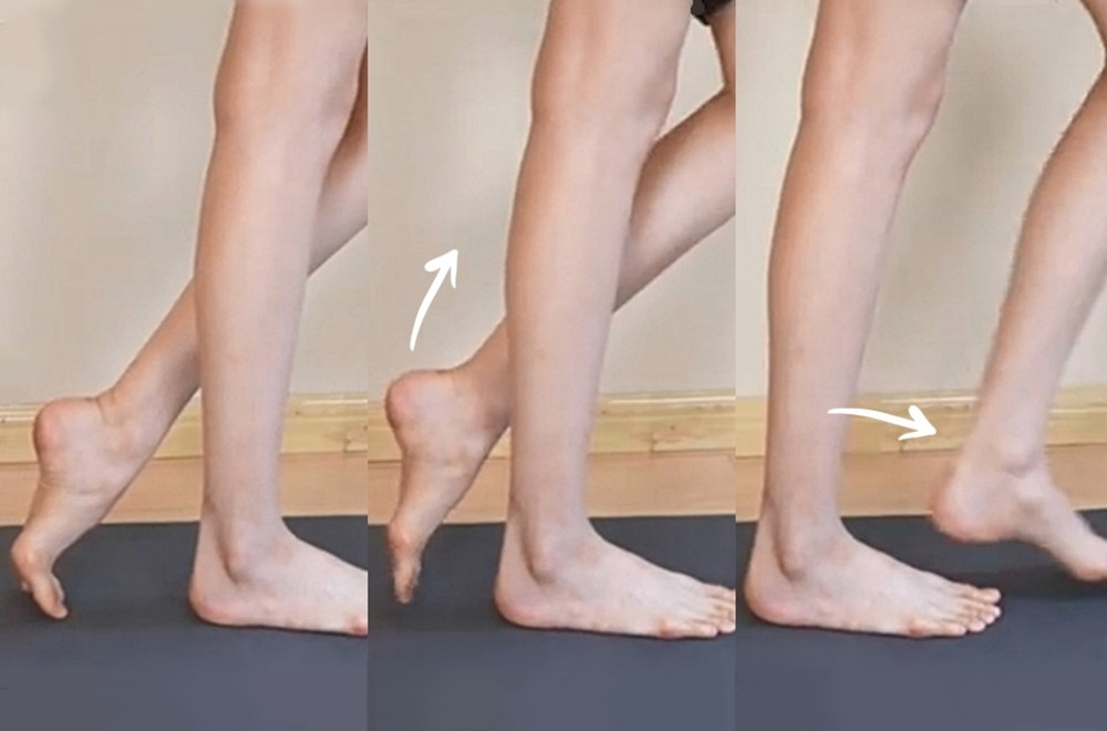 走路時是自然的踏步,當前腳往前跨出一步、腳底整個貼地時,後腳腳趾就可以離地並往前邁出一步,之後再以同樣以腳後跟著地、腳掌外側、最後是腳趾。