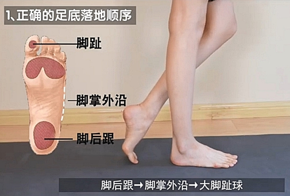 走路時,正確的足底落地順序應該是從腳後跟著地、接著是腳掌外側、最後是腳趾,這是一個完整的踏步動作。