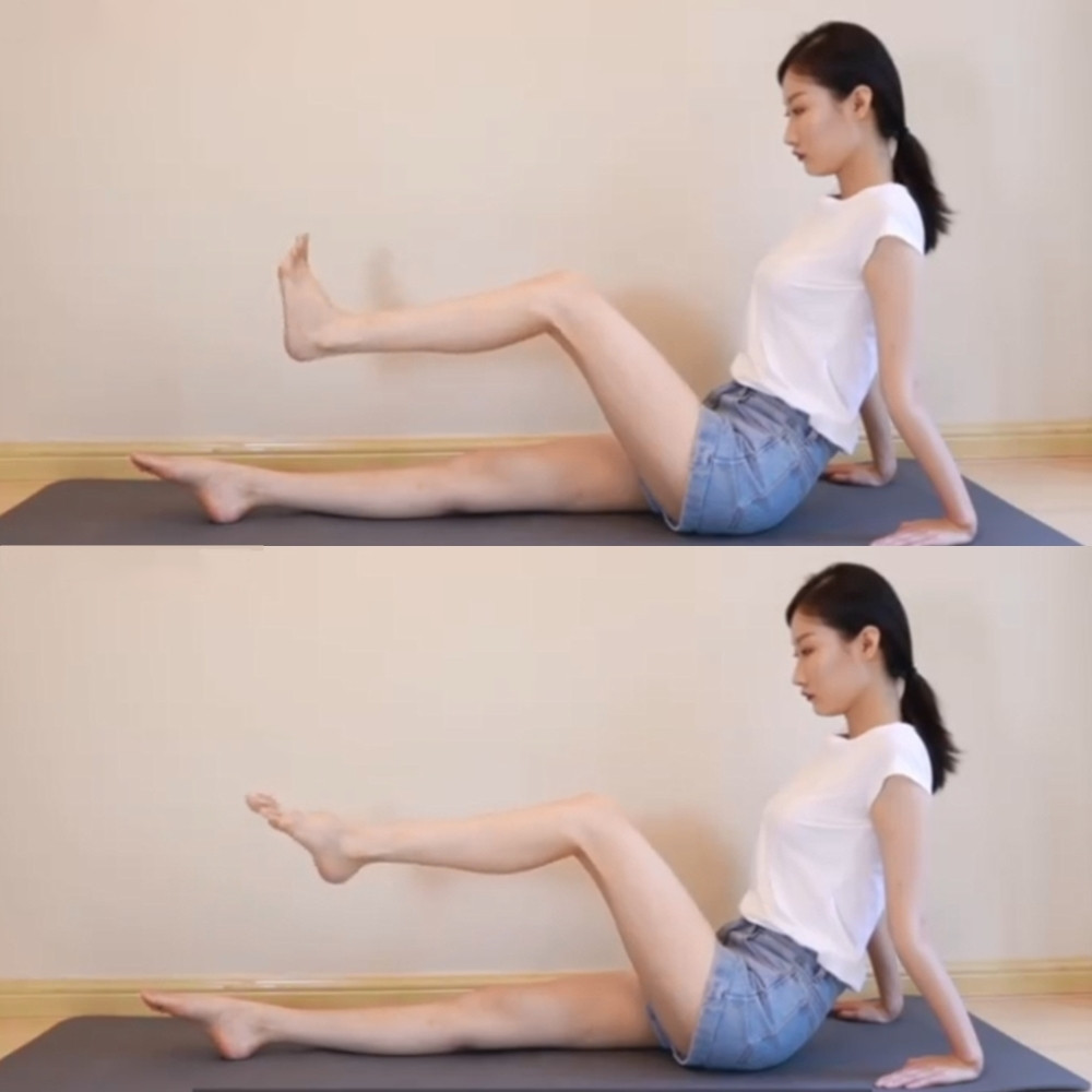 坐在地面上雙腳向前伸直,身體微微向後傾、以雙手向後撐地,腹部施力將單腳向上抬起、膝蓋呈約90度,接著維持高度不動、將腳掌懸空畫圈轉動腳踝,另一隻腳則貼地、腳背弓起,這個動作可以很好的伸展腳踝及腿部肌肉、對腹部的核心也有運動效果,可以讓腳踝及腿部線條變的更纖細緊實。