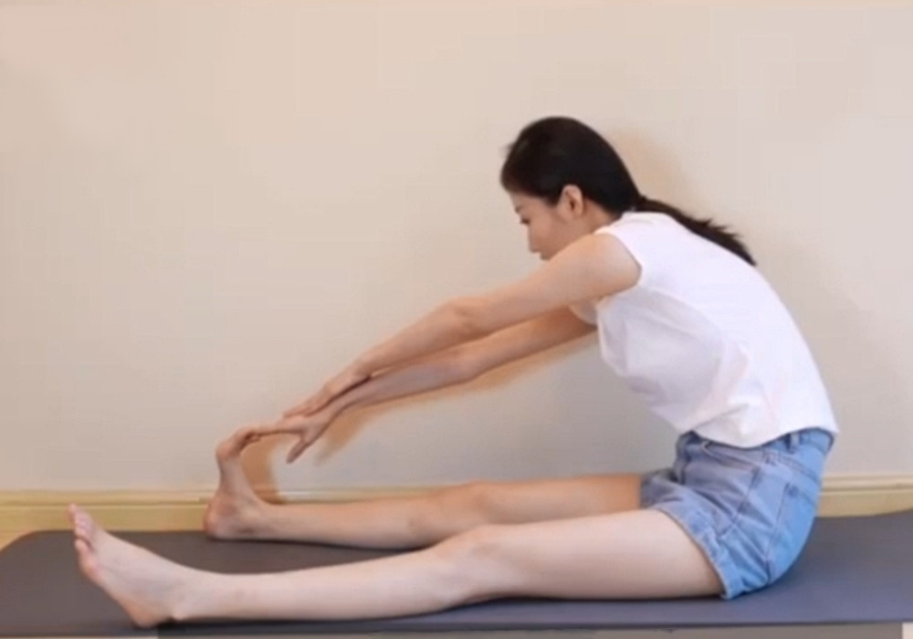坐在地面上將雙腿向前伸直,上半身往下彎、將雙手勾住腳背拉伸腿部,盡可能感受到小腿及大腿後側的伸展,最後伸展可以幫助肌肉放鬆,拉長肌肉線條。
