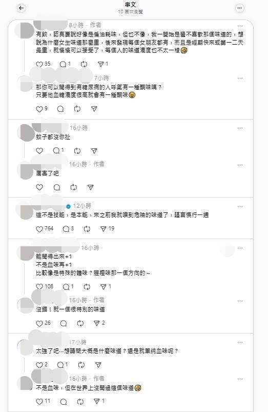 不是血味!網友分享自己的嗅覺能預知每任女友「生理期」,掀起網友熱烈討論。圖片來源:threads