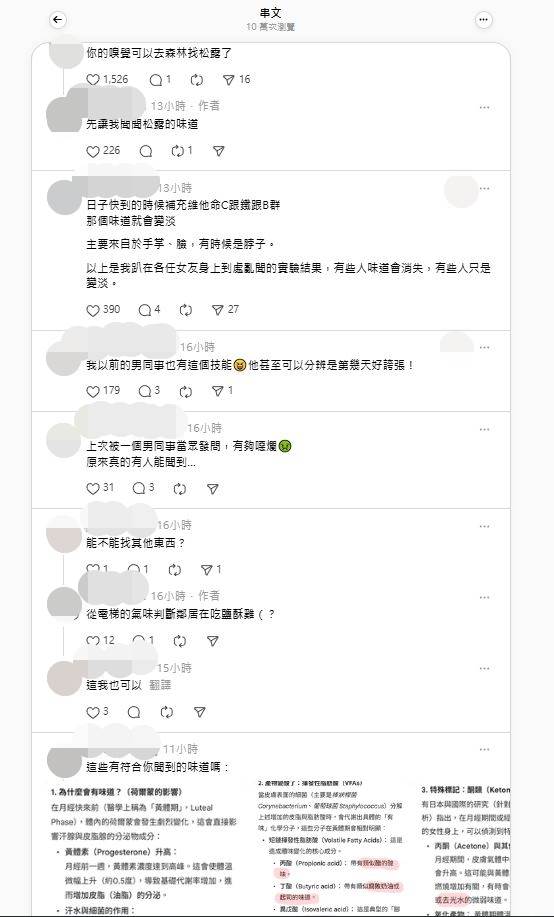 原PO曝光自己能用「嗅覺」預知女性經期技能的貼文後,不到1天吸引10萬次瀏灠,掀起網友紛紛附議:「男同事也有這個技能,甚至可以分辨(女性經期)是第幾天,好誇張」、「上次被一個男同事當眾發問,原來真的有人能聞到」、「我男友也曾(在經期來前)問過我」、「學妹在我月經來時,跟我說月經很好聞」。
