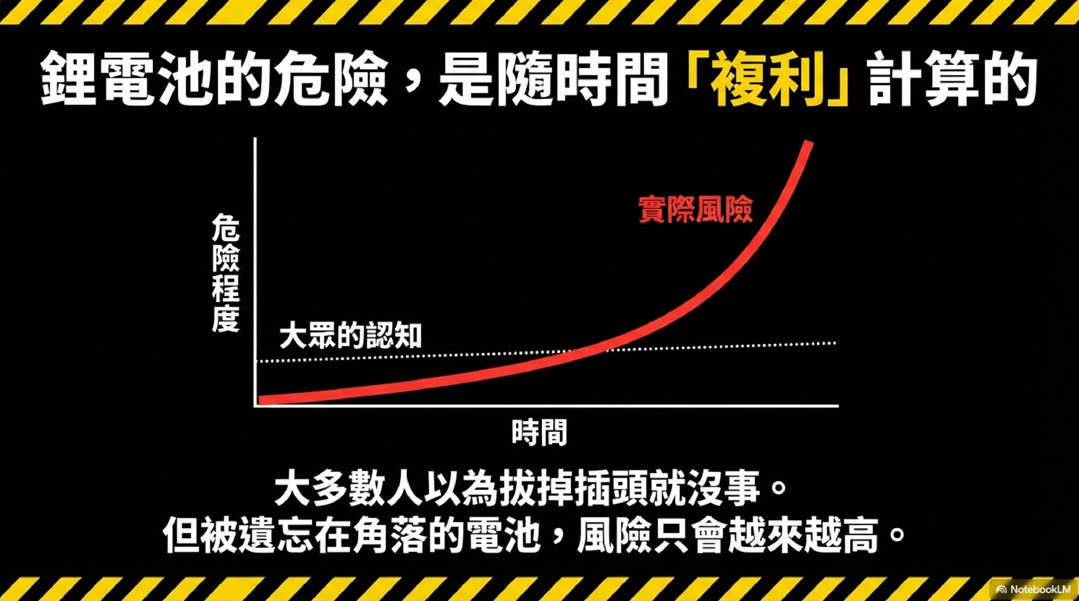 「消防神主牌」進一步說明:「舊電池的化學物質會老化、結構會崩解(膨脹)。它們不需要插電,光是靜靜躺在那裡,就有可能因為內部短路而自燃」,且特別以圖解表示,鋰電池的危險,隨時間「複利」計算,多數人誤解不插電就沒事,但風險會隨著忘記久放而越來越高。
