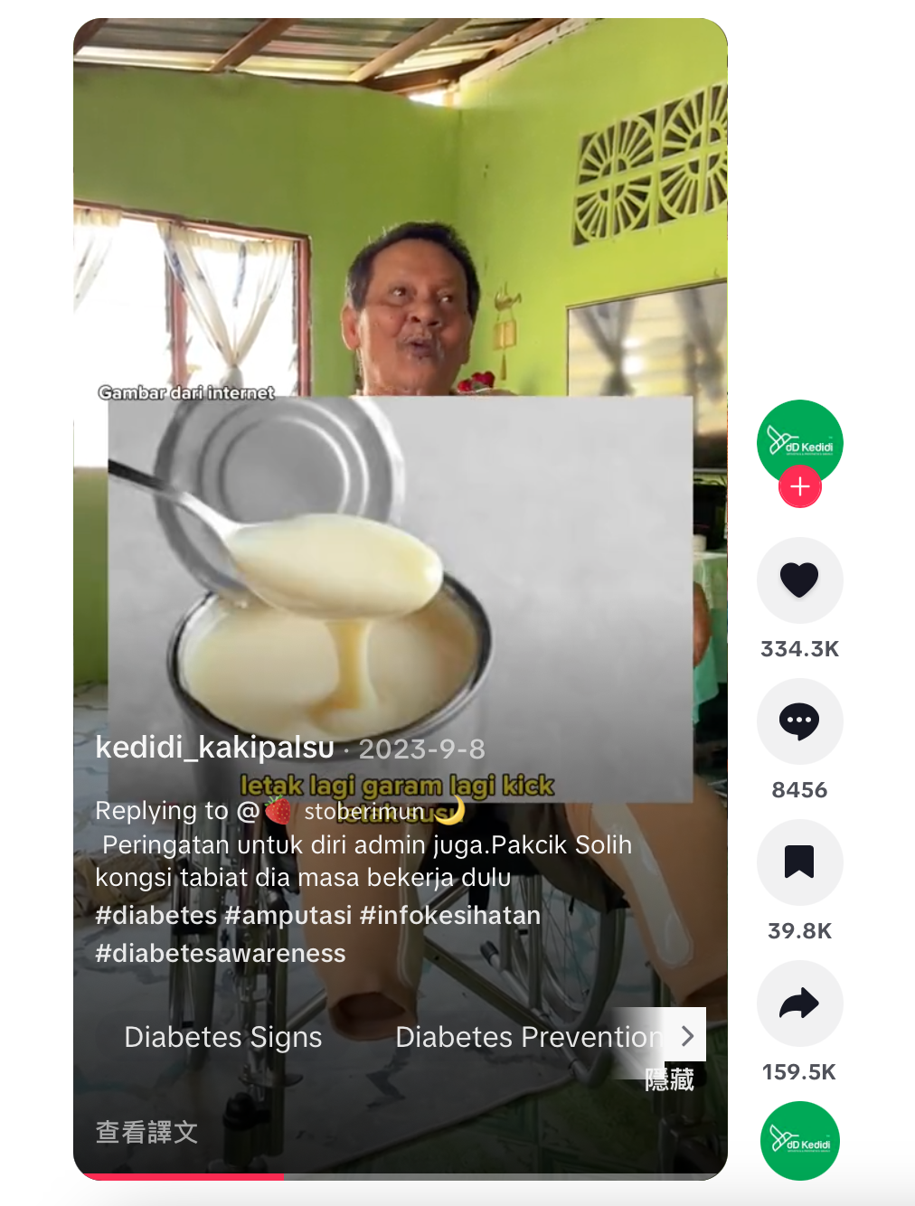 根據馬來西亞媒體《中國報》與《星洲網》報導,當地義肢製造商「Kedidi Kaki Palsu」近日在TikTok上分享一段影片,主角是一名因糖尿病併發症而失去雙腿的男子。影片中,他坦言過去自認身體硬朗、經濟條件也不差,從沒想過健康會這樣「突然抽走」。