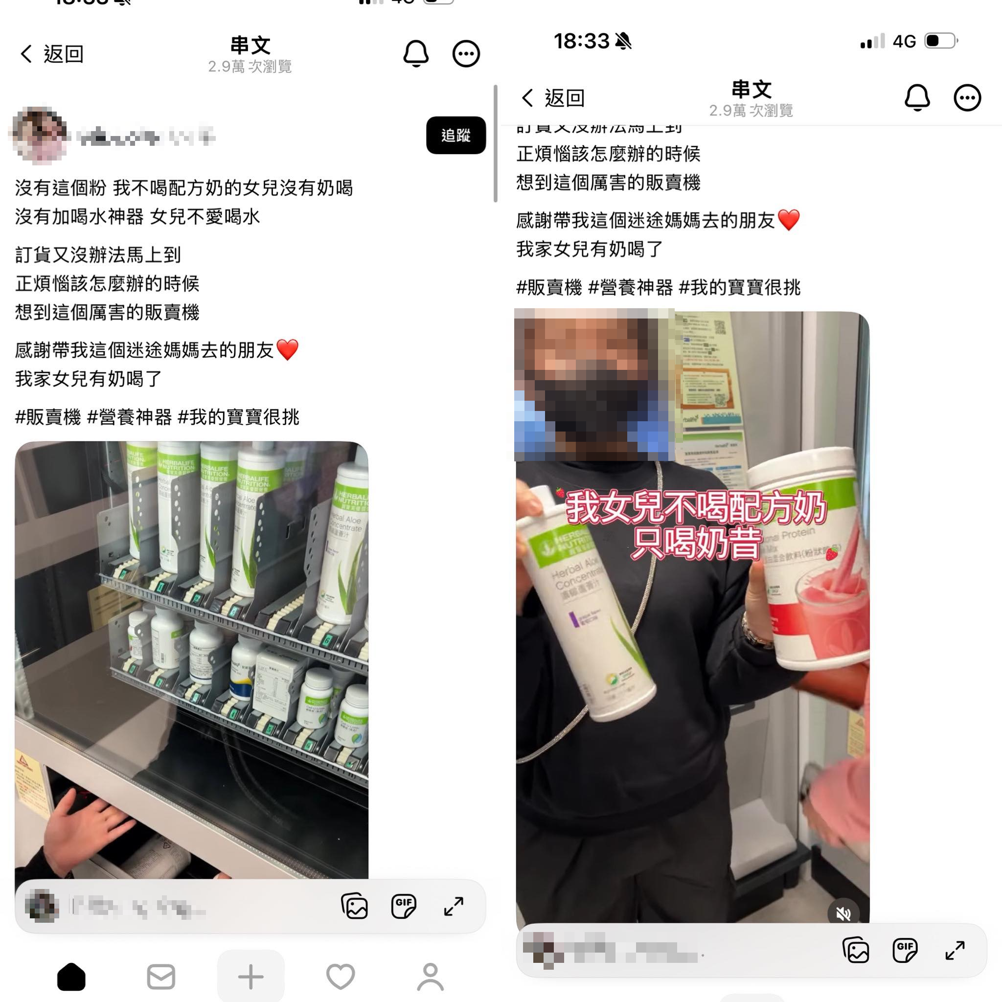 從貼文內容可見,原 PO 表示自己不喝配方奶,女兒「沒有奶喝」,也沒有使用「喝水神器」,在訂貨來不及、感到焦慮時,想起朋友帶她接觸的「販賣機」,最終讓女兒改喝成人奶昔,並直言「我家女兒有奶喝了」,相關貼文甚至加上「#營養神器」、「#我的寶寶很挑」等標籤。照片中也可見直銷門市場景,並標註「我女兒不喝配方奶,只喝奶昔」等字樣。