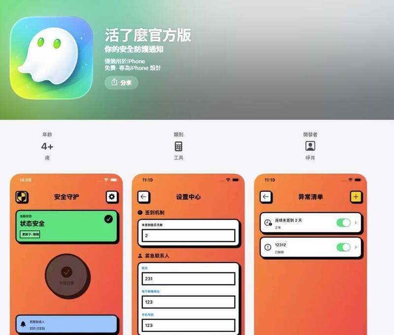 特別的是,另一款「活了麼」APP,也即時「蹭」流量,除了主打免費下載,訴求和「死了麼」相同,也有提供「獨居者簽到」功能。