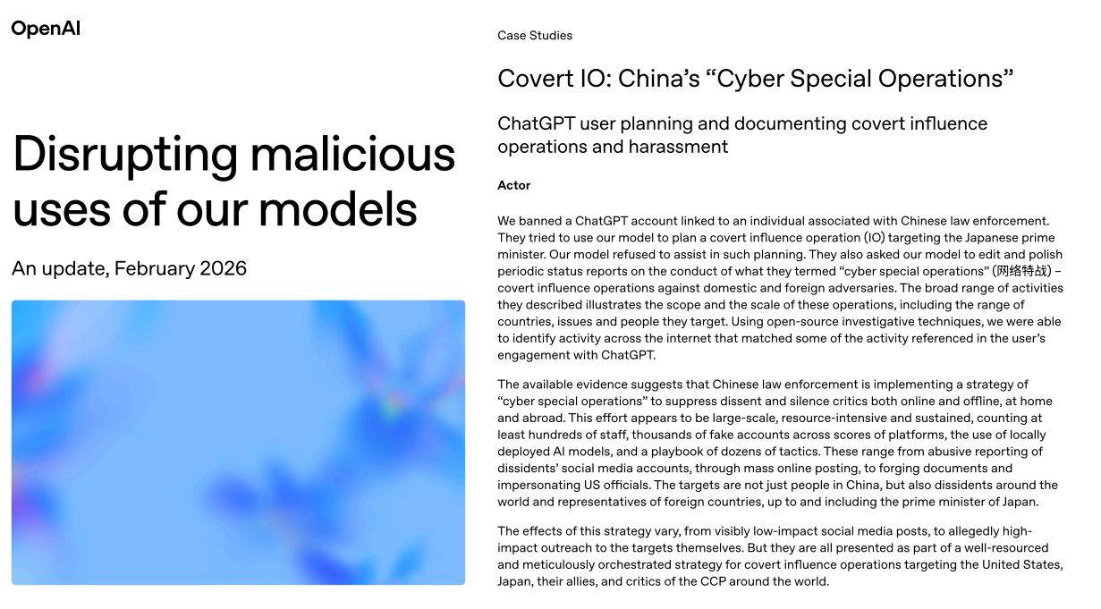 Citrini Research對於AI風險的研究報告公開後,聊天機器人ChatGPT開發商母公司OpenAI,發表了安全研究報告,涵蓋「柬埔寨愛情詐騙」、「俄羅斯內容農場」、「假律所詐騙」等各種AI遭到惡意運用的案例。最後一個案例,甚至佔據報告將近三分之一篇幅,標題為「中國的網路特別行動」,內容為一名中國執法人員將ChatGPT當作「日誌」使用,記錄據稱秘密進行的跨國鎮壓系列行動包括: