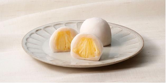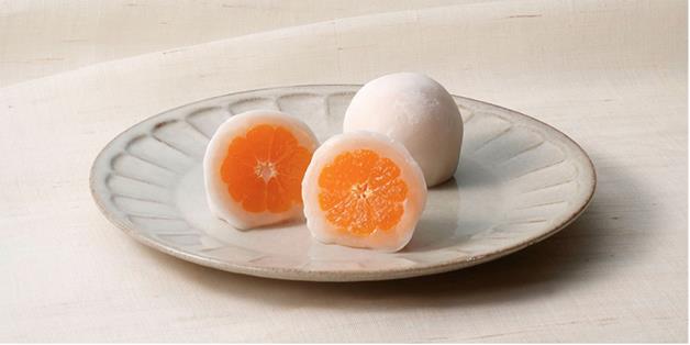 在多種水果大福之中,不分季節可以選擇的水果,有橘子、鳳梨、跟蘋果等等。