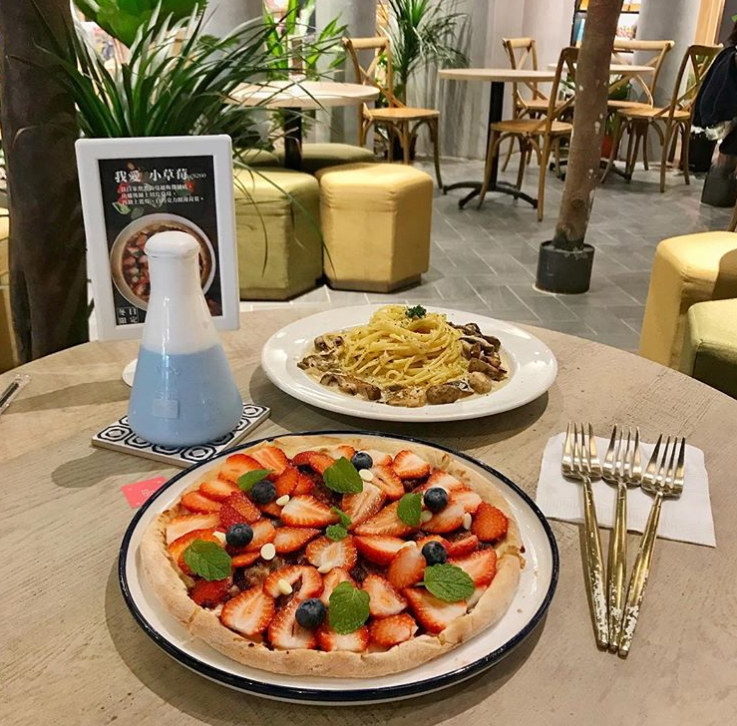 那個那個咖啡,在書店的中央,還有滿滿的植栽包圍,好像來到森林裡野餐的清新感,而且還有特色的牆面寫著「跟我一起那個那個好嗎」,根本逼人充滿遐想(哈)披薩一直也是店內招牌,其中最多人點的就是「草莓披薩」,滿滿的切片草莓佈在上頭,真的好膨湃~
