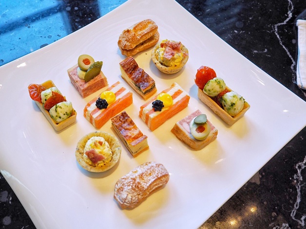 這天的鹹點有熟肉抹醬意可蕾、鹹派、雞蛋沙拉塔、法式肉凍、番茄與莫札瑞拉起司塔以及煙燻鮭魚佐奶油起司。最令人高興的是每日鹹點的內容都不同,這一點真的很棒對吧!
