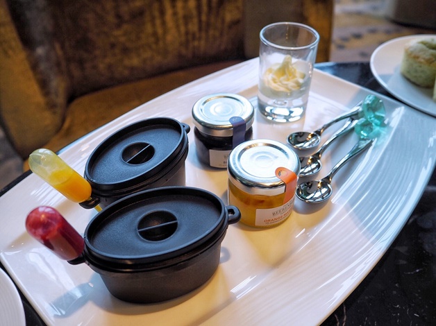 司康有原味司康和紅茶司康2種。另附藍莓果醬、橘子果醬以及英式奶油。