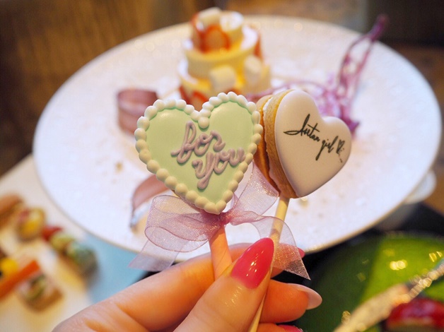 正中間的蛋糕上還有2根糖衣餅乾棒棒糖。2根都是愛心形狀非常上相!拿著棒棒糖一起拍照肯定很讚!盤子上還有一個蝴蝶造型的捏糖擺飾。除了可愛之外店家也十分重視美感哦!
