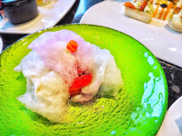 綠色小盤子上的甜點有2種。分別是蘋果與藍莓的棉花糖蛋糕。不知道會吃到哪種口味也是當天的樂趣之一。蛋糕上正如其名地覆蓋一層棉花糖。其實,吃這個蛋糕的時候要搭配附上的2種醬汁!將醬汁淋在棉花糖上,棉花糖會瞬間消失不見,如此悵然若失的感覺正適合錄影……♡