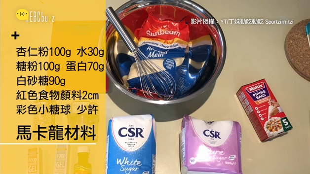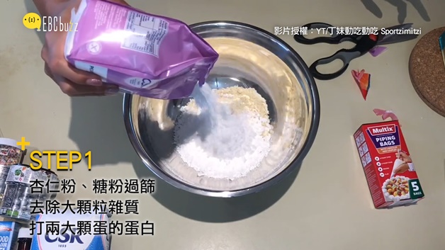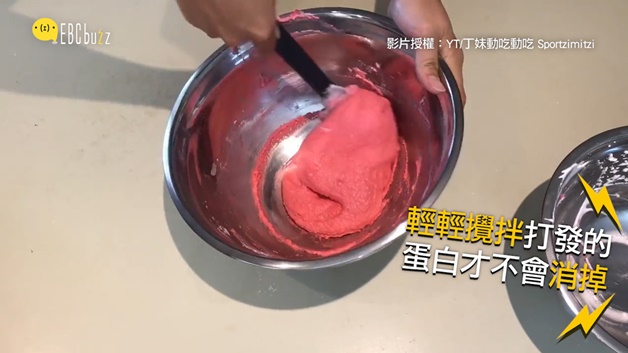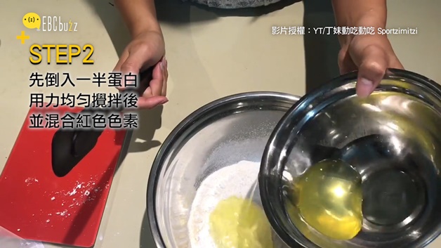 把杏仁粉跟糖粉混在一起過篩,去除過於大顆的雜質,打了兩顆蛋分離出蛋白的部分,先倒入一顆的蛋白,用力攪拌均勻,並加入紅色色素,但是一次別加太多,慢慢調至自己喜歡的粉紅色