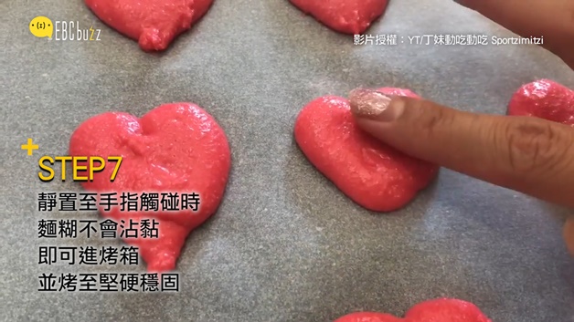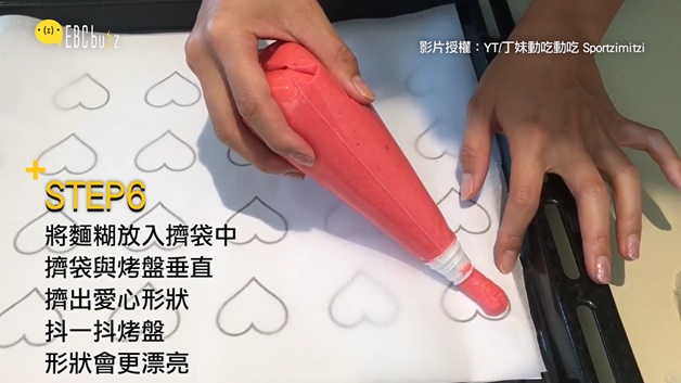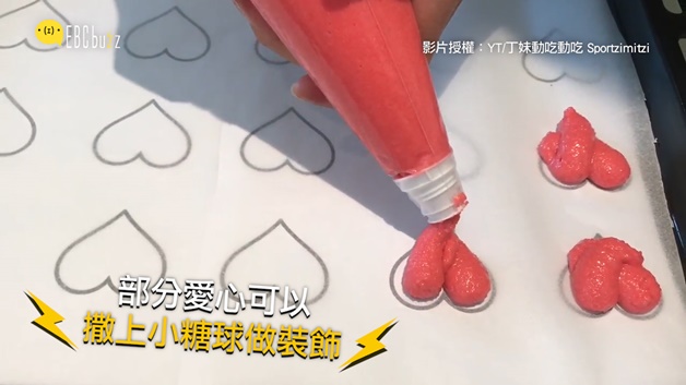 擠花袋記得要跟烤盤垂直,像畫面中這樣還不行哦!如果愛心形狀不好看,可以抖一抖烤盤,形狀就會變得比較均勻比較漂亮哦