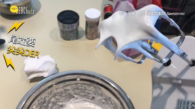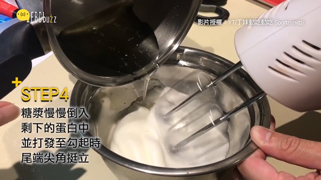白砂糖倒入30g的水中加熱,溫度到118度後緩緩的加進剩下的蛋白中,並打發到蛋白尾端尖角挺立