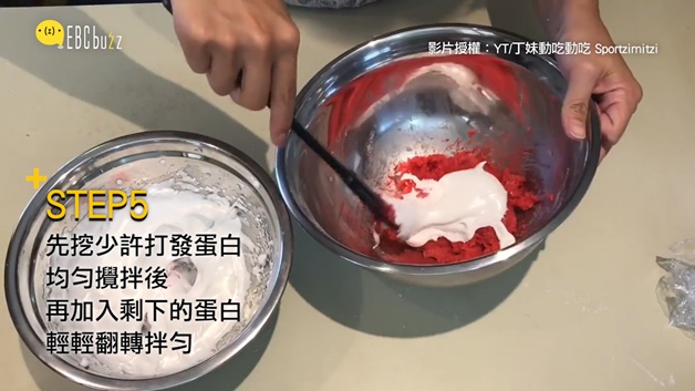 把一小部分的蛋白挖進麵糊當中,均勻攪拌之後,質地接近才可以將剩下的蛋白加入,輕輕攪拌別讓打發好的蛋白消掉囉 ⸜(* ॑꒳ ॑* )⸝