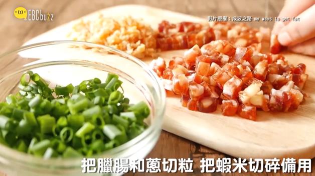 然後就是切切切的備料時間惹,把臘腸、蔥、蝦米切碎備用
