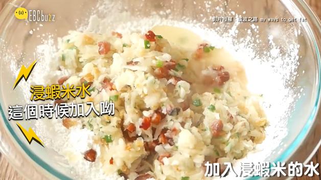 然後把炒好的配料們倒進在來米粉&玉米粉裡面,這時候把剛剛留下來的蝦米水也加進來