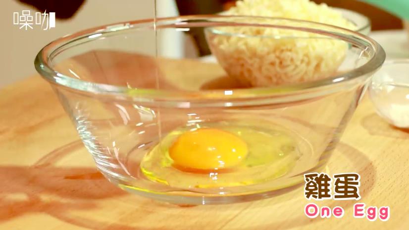 先將雞蛋打散,倒入已燙熟的泡麵及麵粉攪拌均勻~啊記得哦~那個泡麵是熟了之後有把水倒掉的,就是乾的熟泡麵的意思~
