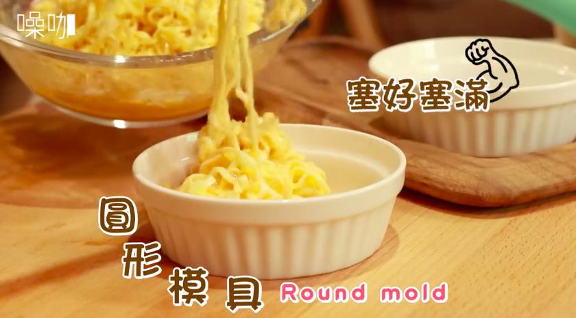 接著準備兩個小的圓型模具,記得兩個尺寸要一樣的~將混合蛋液的泡麵平均分成兩份然後裝進去,鋪上保鮮膜後把裡面的麵條給壓緊,再來放入冰箱冷藏15分鐘!