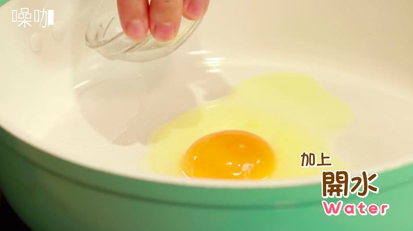 然後將雞蛋倒入鍋中,在鍋邊倒入一些水之後,蓋上鍋蓋燜至蛋白熟,然後再把冷藏完的泡麵請出來,把泡麵當成漢堡的餅皮的概念!放入平底鍋煎到金黃酥脆,真的要忍住不可以在這個階段就受不了誘惑先把麵給吃掉了內XD