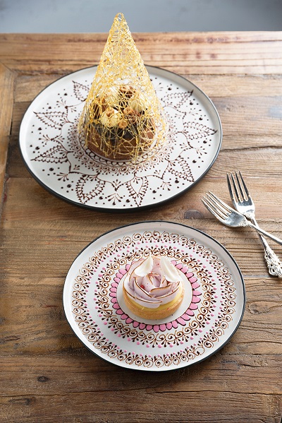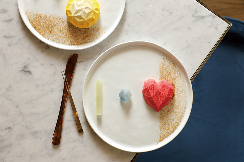 夏彌爾的羽毛180元(前)/羽毛狀白巧克力、小紅莓蛋白糖霜、萊姆慕斯與法式檸檬塔組合而成,酸甜口感在味蕾交融。烏列爾之巔200元(後)/巧克力戚風蛋糕佐以巧克力甘納許與焦糖巧克力奶油,黃金色澤的手工拉糖增添華麗氣息,苦甜不膩的滋味讓人驚艷。