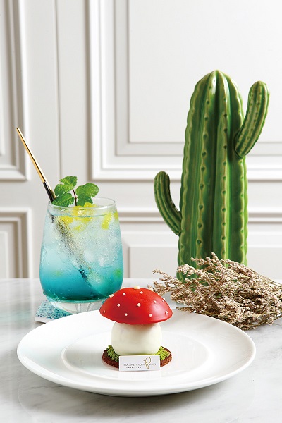 小紅傘220元(前)/以經典黑森林口味去做翻轉,濃郁巧克力搭配有顆粒的櫻桃餡,超可愛蘑菇造型讓人看了就想吃。碧空160元(後)/以法國水蜜桃果露、藍柑橘果露調製而成,漸層顏色有如藍天一般漂亮。