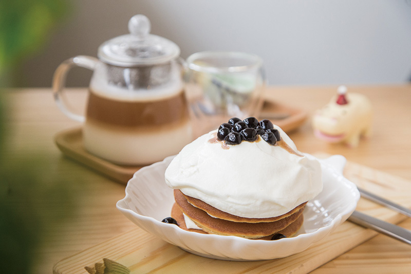 白水鬆餅120元(前)/日系風格甜點,將一般鬆餅替換為銅鑼燒呈現,顛覆一般人對既定甜食的印象。白水奶茶120元(後)/採漸層視覺呈現,不甜膩的口感與鬆餅極搭。