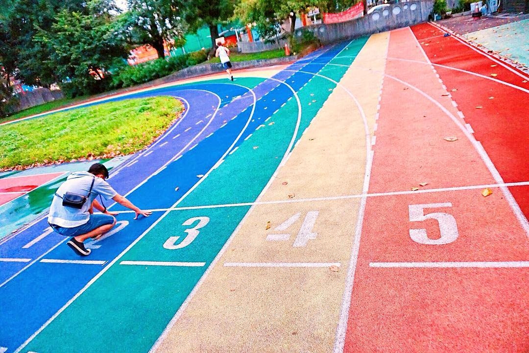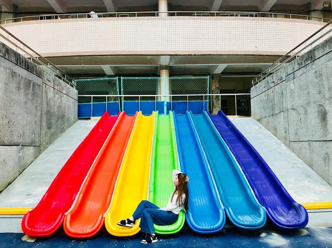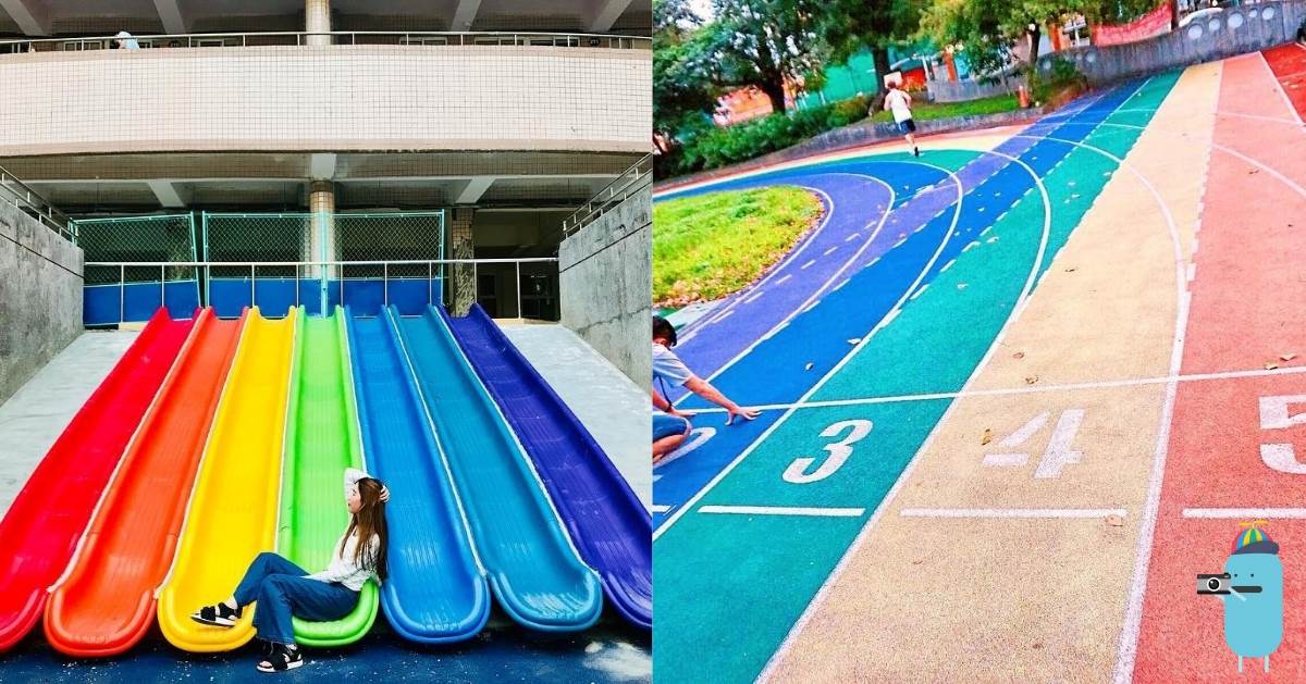不是像傳統紅色的pu跑道,這邊的運動場跑道也是七彩的,整個都超級繽紛,運動起來都覺得心情更好~小朋友在遊樂場玩,大人可以在運動跑道上運動強身~真是一舉兩得啊!但自從開放入場遊玩後,人潮慢慢地變比較多,因為畢竟還是學校,因此要小心不要打擾到上課的學生與學校教育工作者們哦!並且把隨身垃圾都帶走,留下一個乾淨美麗的校園~