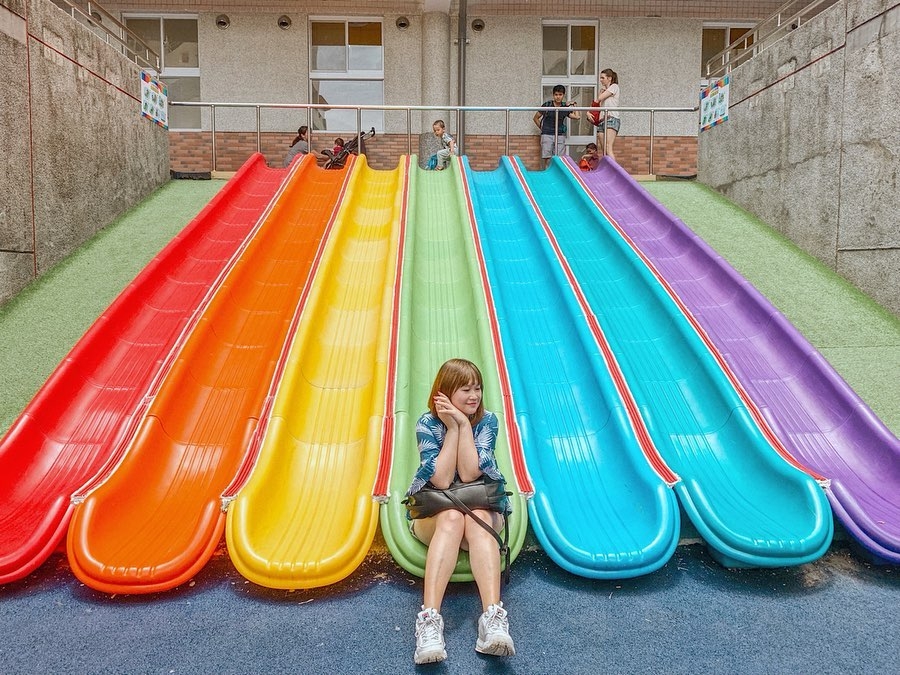 除了彩虹溜滑梯之外,2019年共融遊具也加入陣容,包含了彈跳床、鳥巢鞦韆、多人旋轉盤與座椅式泰山溜索~根本是遊樂園來著啊!原本的磨石子溜滑梯也都還在哦!