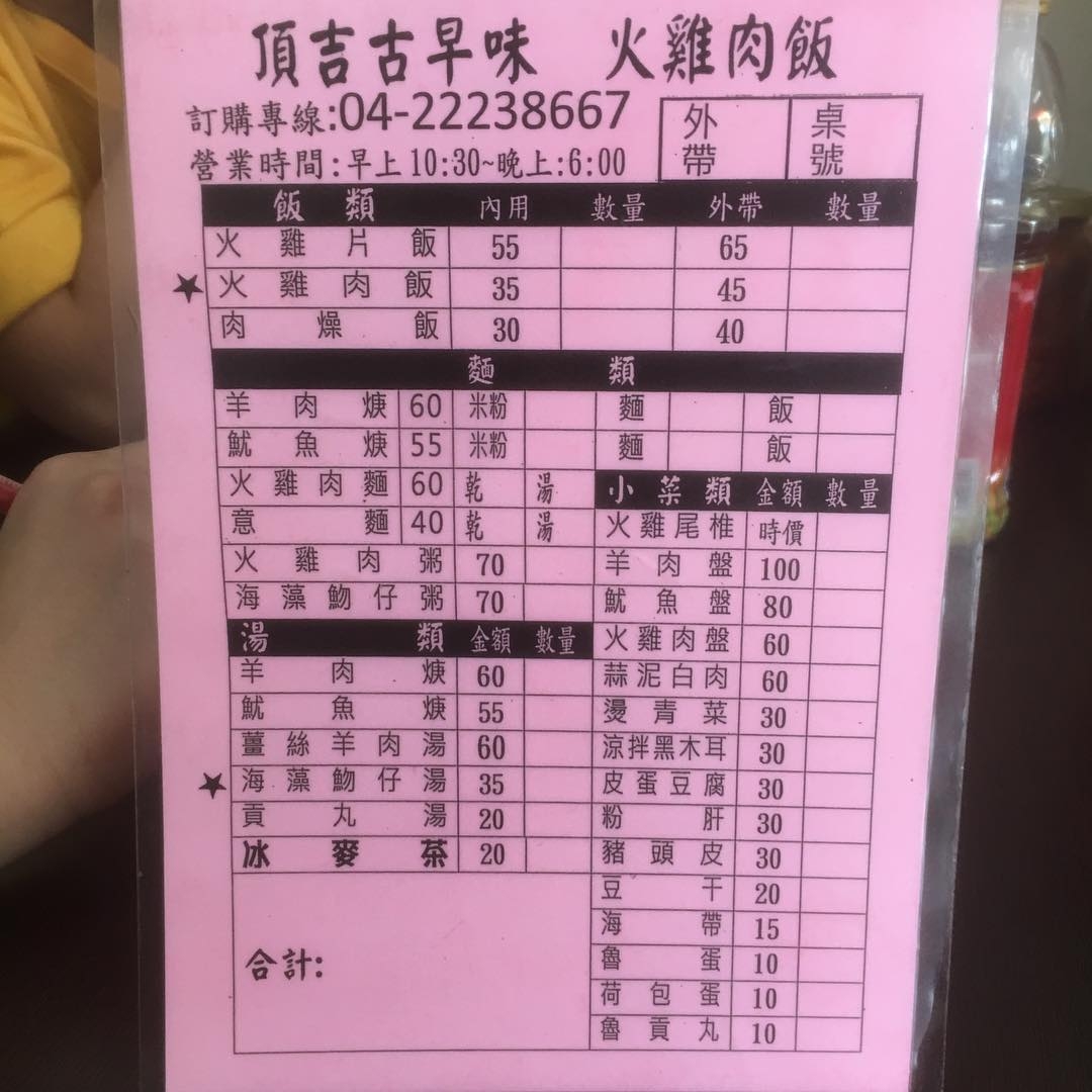 台中頂吉古早味火雞肉飯位在台中公園附近,價格平易近人,而且還有大塊肉片的火雞肉片飯,生意很好總是高朋滿座,大部分的人都是點選火雞肉片飯再外加一顆荷包蛋,半熟的荷包蛋汁,混著雞肉飯一起吃美味度大大提升了,肉片也是軟嫩不甘柴,許多人吃過之後總是念念不忘瘋狂回訪呢!