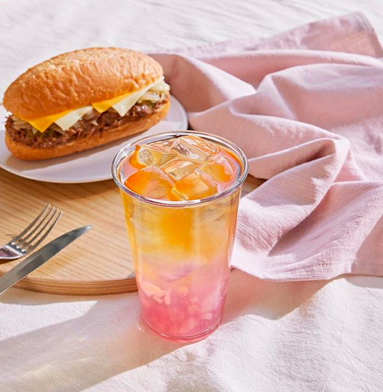 跟小編一樣喝冰沙牙齒就酸到不行的話,韓國星巴克也另外推出這款「桃色冰茶」或許會很適合你唷!這款冰茶中帶有蜜桃香,同樣加入果凍,整杯漸層色調的飲料,超級適合夏天,喝下一口感覺整個人都能從炎炎夏日中復活過來!