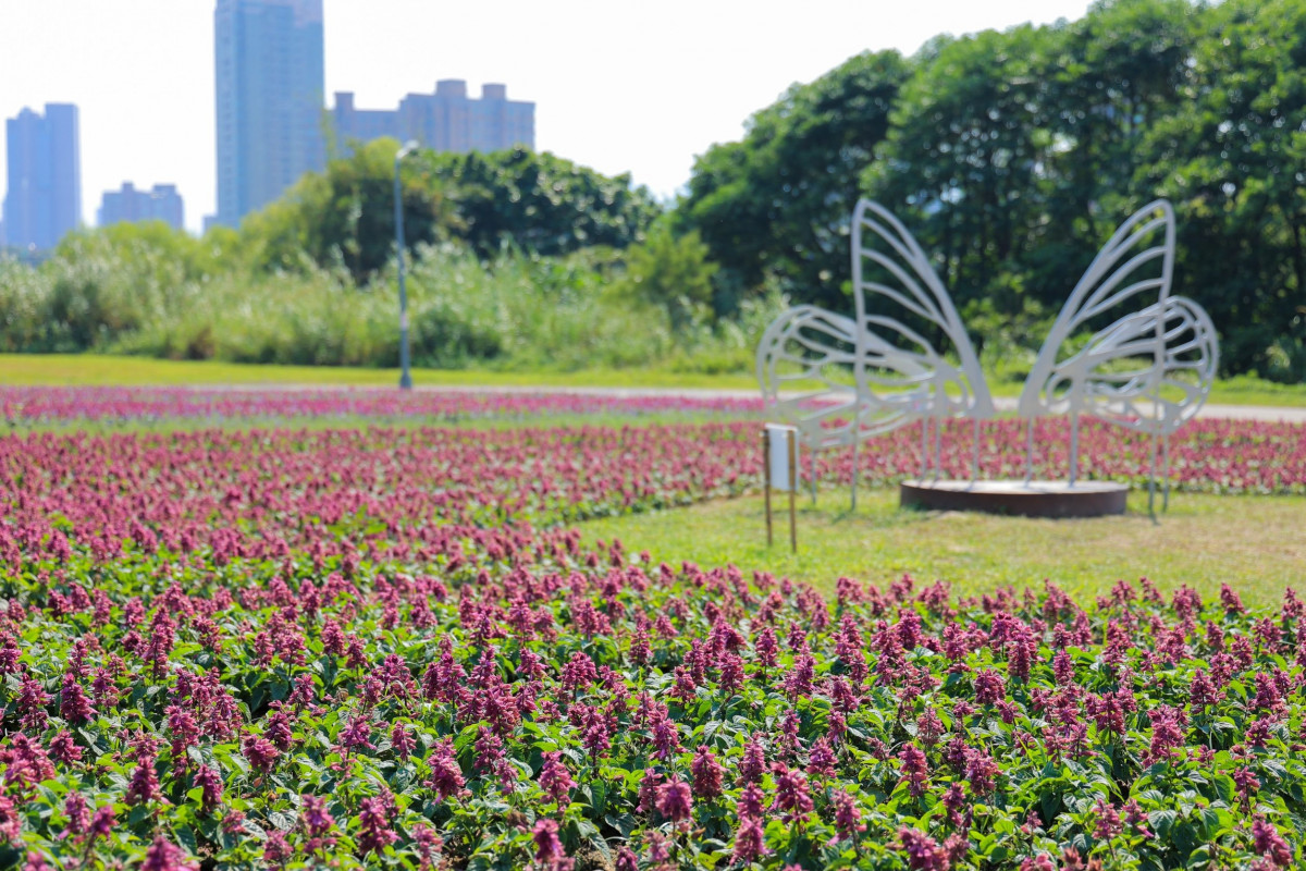 另外,古亭河濱公園內除了有美麗花海可以朝聖外,還設有不少特色裝置藝術,像是有置於花海中央的蝶翼造型不鏽鋼裝置藝術,如果找時間來到古亭河濱賞花海的話,記得不要錯過這些好拍裝置藝術囉~
