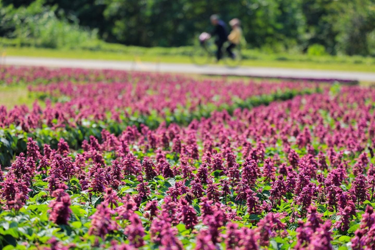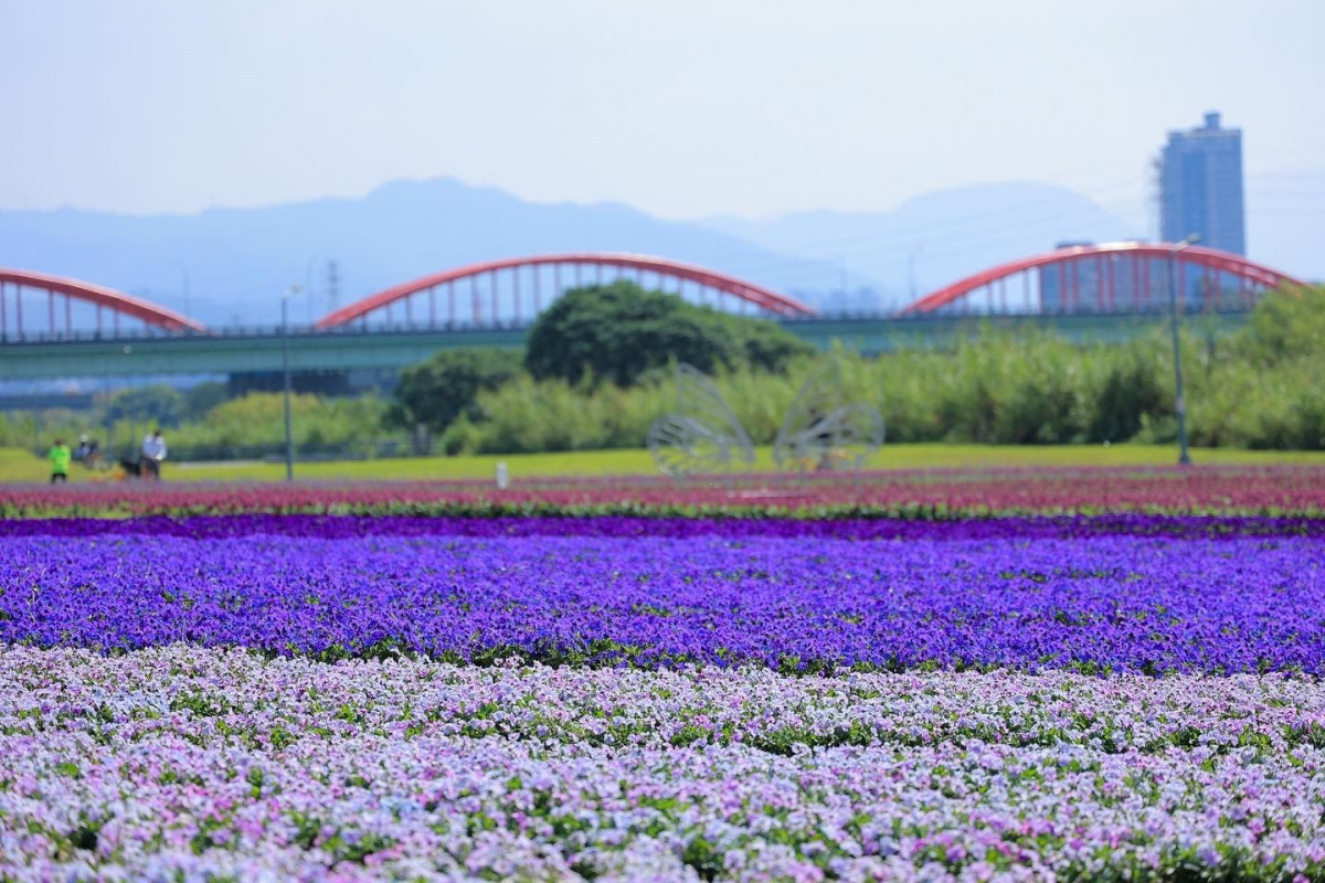而這次的古亭花海還特別選用植栽矮小、多花且具有特殊香氣的「香堇菜」當主角,再搭配直立的一串紫及羽葉薰衣草,以不同質感的紫色花朵,營造出不同於其他河濱花海的特色,並打造出媲美日本芝櫻般綿延不絕的地毯花海!
